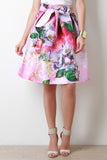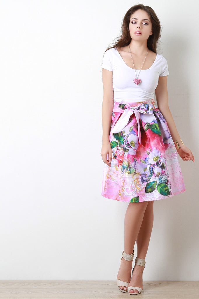 This chic midi skirt features a colorful floral print throughout, taffeta bodice, wide waistband with a self-tie bow design, and box pleats. Finished with a side zipper closure. Accessories sold separately. Made in U.S.A. 60% Polyester, 35% Nylon, 5% Spandex.