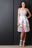 This skirt features a scuba knit fabrication, floral garden and butterflies print, wide elasticized waistband, and box pleating. Finished with a midi-length raw hemline. Accessories sold separately. Made in U.S.A. 92% Polyester, 8% Spandex.