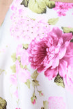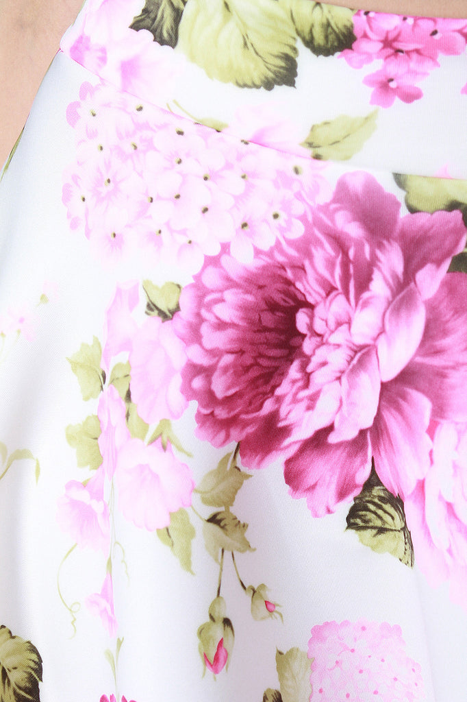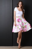 This high waist midi skirt features a double knit neoprene fabrication, wide waistband, soft floral garden print, circle skirt silhouette, and a raw unfinished hemline. Accessories sold separately. 95% Polyester, 5% Spandex.