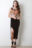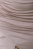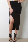 This midi skirt features a hidden elasticized waistband, overlapping silhouette with front cutout opening, side ruched design, and asymmetrical hem. Accessories sold separately. Made in U.S.A. 95% Rayon, 5% Spandex.