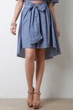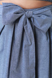 This midi skirt features chambray fabric, a-line cut, self-tie bow, back zipper closure, and slight high-low hemline. Accessories sold separately. Made in U.S.A. 100% Cotton.