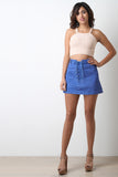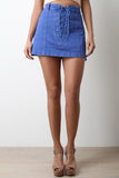 This denim skirt features a high waisted design, corset lace-up front, belt loops, zipper fastener at back, strategically place seams, and a slight flare cut fit. Accessories sold separately. 97% Cotton, 3% Spandex.
