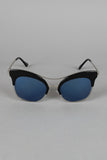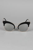 These sunglasses feature semi-rimless cat eye frame, metallic trim, double bridge, and nose cushions.