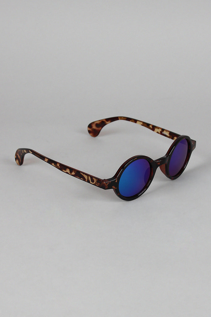 These sunglasses feature horn rim style frame, round mirrored lenses, and single nose bridge.