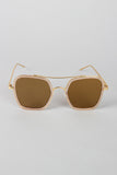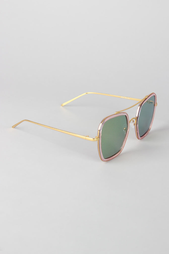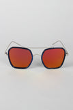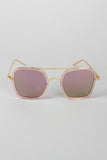 These sunglasses feature metallic and plastic frame, mirrored lenses, double bridge design, and nose cushions.