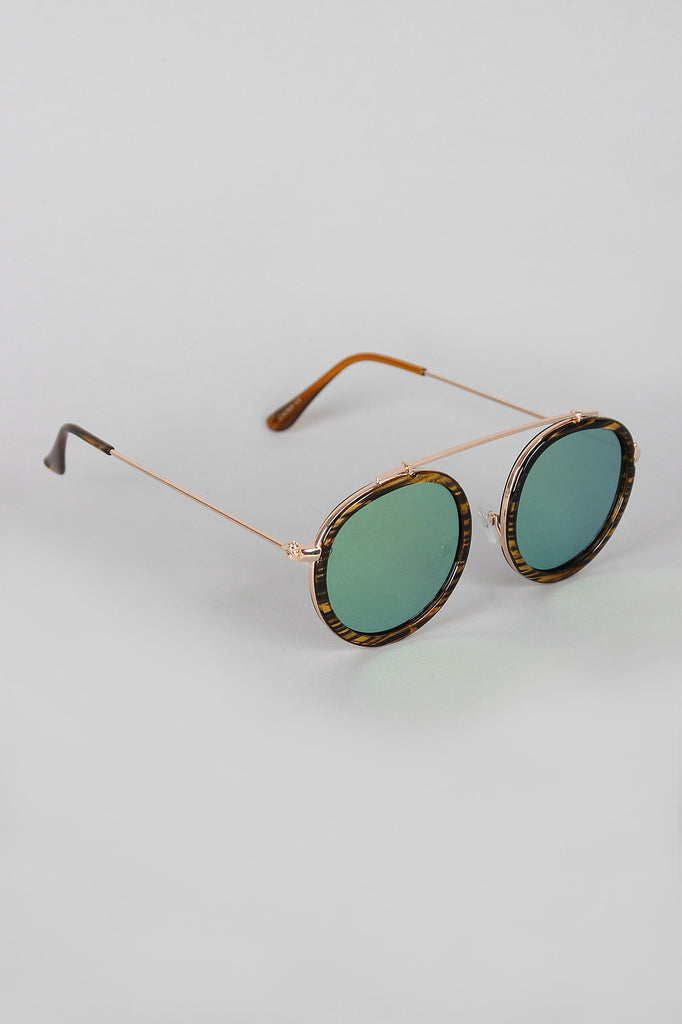 These sunglasses feature metallic and plastic frame, round glasses, single top bridge, and nose cushions.