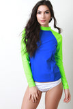 This swimwear rash guard cover-up top features a mock neckline, raglan seam long sleeves, color blocked contrast design, and princess seam. Accessories sold separately. 80% Nylon, 20% Spandex.