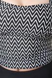 This two piece tankini swimsuit features a chevron pattern print, tankini top with wide shoulder straps to a crisscross self-tie back, elasticized ruched sides, empire seam, and removable cup padding. Bottom half features a high rise waist, brief bottom, and side ruffle accent. Accessories sold separately. 80% Nylon, 20% Spandex. Lining: 100% Polyester.