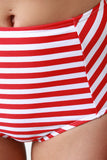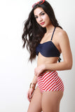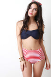 This bikini set features a solid twisted bandeau bikini top, removable halter straps, self-tie back, removable cup padding and partially lined. Bottom features a striped design, high waisted, strategically place vertical seam, brief bottom, and fully lined. Accessories sold separately. 80% Nylon, 20% Spandex. Lining: 100% Polyester.