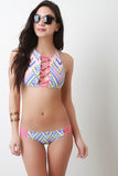 This bikini set features tribal chevron pattern design, halter bikini top, corset caged center, and crisscross self-tie back. Low rise bikini bottom features crisscross strappy sides, cheeky back, and fully lined. Accessories sold separately. Made in U.S.A. 80% Nylon, 20% Spandex. Lining: 100% Polyester.