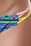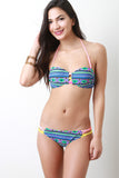 This bikini set features a colorful tribal pattern print, neon strappy accent, sweetheart bandeau top with structure foam padding, underwire, hook back closure, and removable adjustable halter straps. Bikini bottom features a low-rise fit, crisscross strappy sides, and fully lined. Accessories sold separately. 82% Polyamid, 18% Elastan. Lining: 100% Polyester.