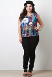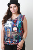 This top is causal sleeveless design with a scoop neckline. Features a comic print design throughout. Finished with a mesh yoke panel and a mesh panel near the waist. Accessories sold separately. 95% Polyester. 5% Spandex.