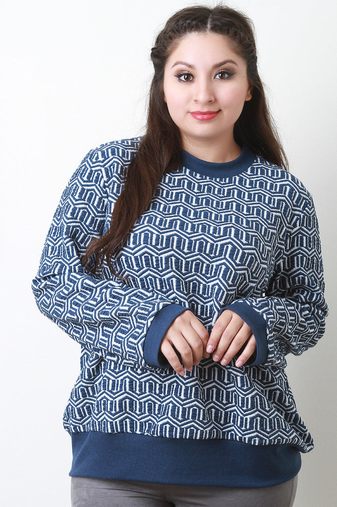 This plus size sweater top features a textured geometric pattern fabrication, crew neckline, long sleeves, relaxed fit, and contrast ribbed knit hemline. Accessories sold separately. 95% Polyester, 5% Spandex.