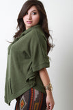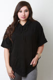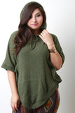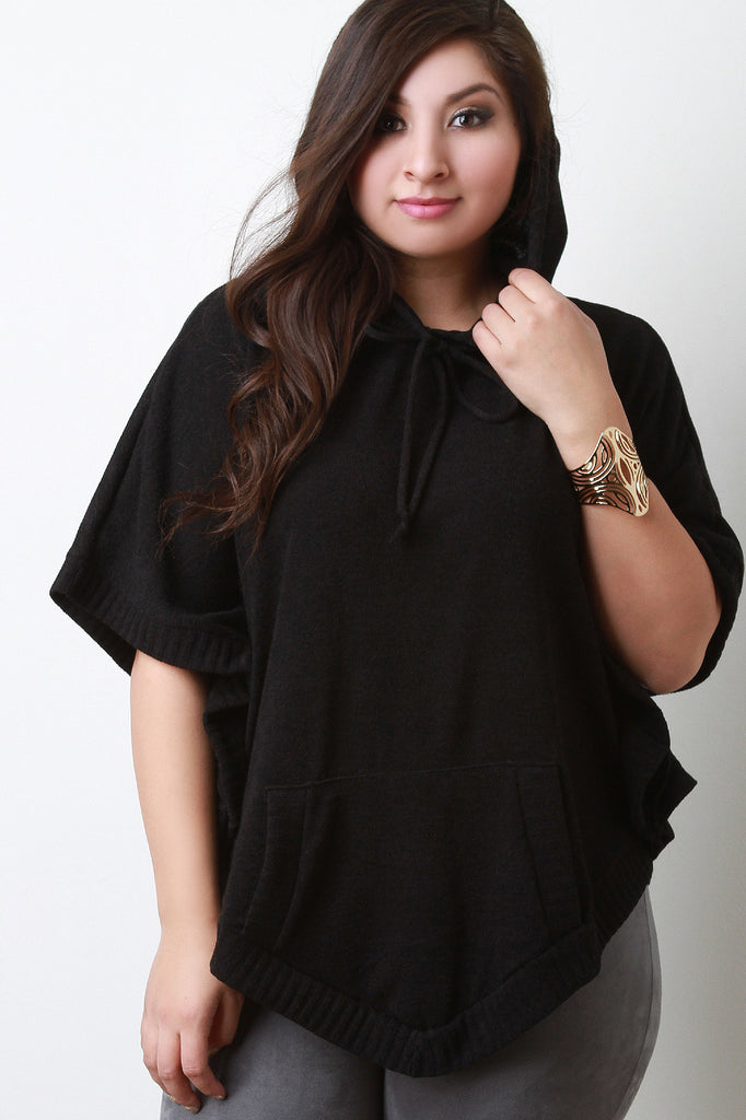 A plus size knit poncho top featuring a drawstring hooded neckline, kangaroo pocket at the front, and a center-pointed hemline with ribbed edges. The sides have armhole openings but are otherwise sewn close. Accessories sold separately. 96% Polyester, 4% Spandex.
