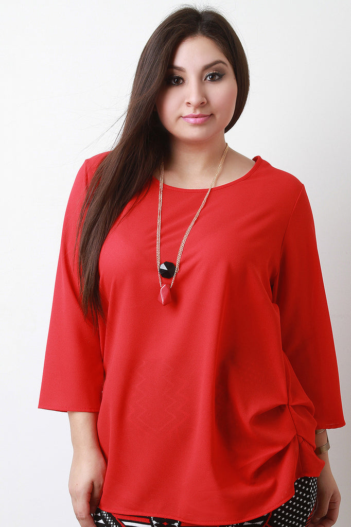 A plus size semi-sheer moss crepe top featuring a round neckline and hemline, three-quarters sleeves, and gathered accents at the sides. Includes layered chain necklace with acrylic shape pendants. Other accessories sold separately. Made in USA. 100% Polyester.