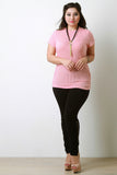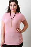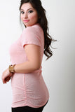 This plus size top features a soft ribbed knit fabrication, mock neck, short sleeves design, and side cinched detail. Accessories sold separately. Made in U.S.A. 48% Polyester, 48% Rayon, 4% Spandex.