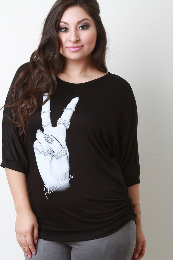 This fashionable plus size top features a peace hand gesture print with rhinestone accents at front, round neckline, dolman sleeves design, and side cinched details. Accessories sold separately. Made in U.S.A. 95% Rayon, 5% Spandex.