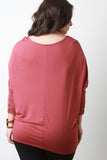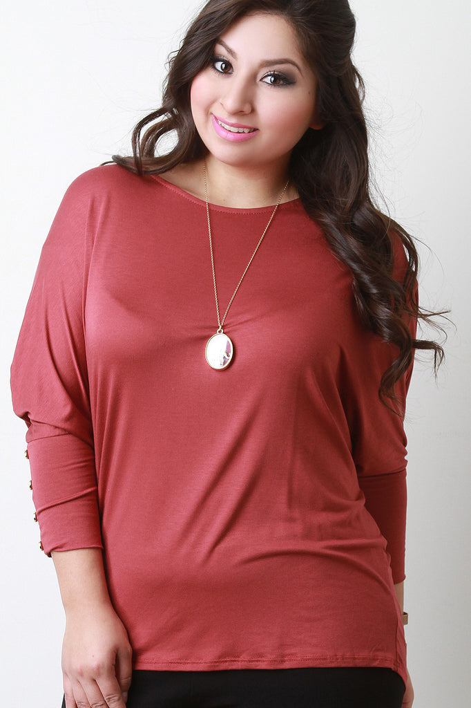 This plus size top features a round neckline, long dolman sleeves with button accented cuffs, and straight hemline. Accessories sold separately. Made in U.S.A. 95% Rayon, 5% Spandex.