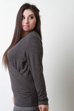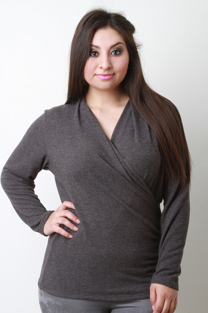 A cozy plus size top featuring a plush fleece-like fabric, v-neck surplice front, and long sleeves. Accessories sold separately. Made in U.S.A. 79% Polyester, 18% Rayon, 3% Spandex.