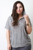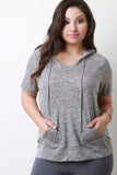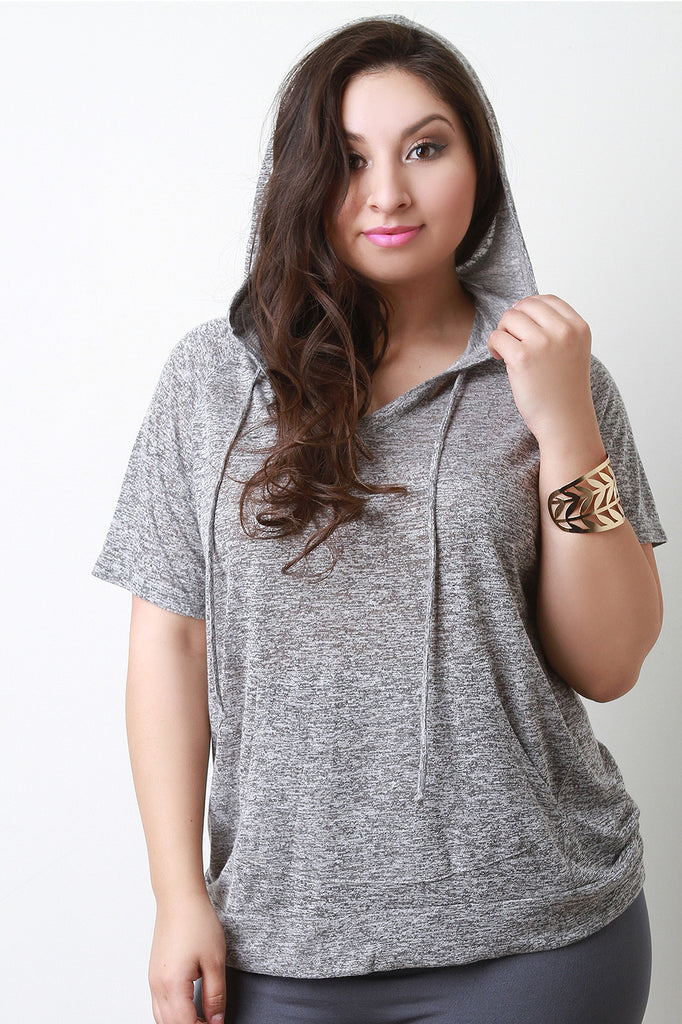 A plus size melange jersey top featuring a drawstring hood, short sleeves, and a kangaroo pocket. Accessories sold separately. 65% Rayon, 35% Polyester.