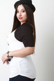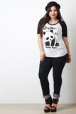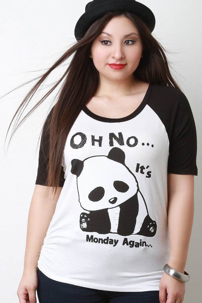 This plus size tee features a round neckline, short raglan sleeves, graphic panda with Oh No It's Monday Again print at front, and side cinched details. Accessories sold separately. Made in U.S.A. 97% Rayon, 3% Spandex.