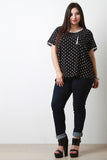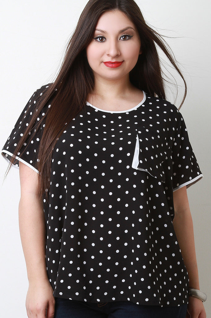 This charming plus size blouse features a polka dot fabrication, round neckline, left chest pocket, short sleeves, contrast trims, and back keyhole cutout design with button closure. Accessories sold separately. 100% Polyester.