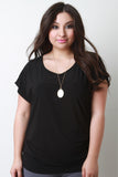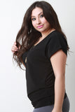 A plus size top featuring a smooth lightweight fabric, round neckline, and short sleeves. Finished with gathered sides. Accessories sold separately. Made in U.S.A. 90% Polyester, 10% Spandex.