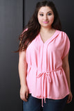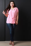 A plus size top featuring lightweight textured fabric, v-neckline with placket front, and short sleeves with gathered shoulders. Finished with self tie waist. Accessories sold separately. 100% Polyester.