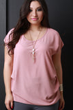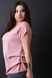 This plus size blouse features a round neckline, short dolman sleeves, keyhole back with a button closure at the nape, and gathered sides design. Top comes with a circle-cut pendant necklace. Other accessories sold separately. Made in U.S.A. 100% Polyester.