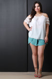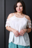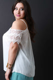 This plus size top features a round neckline, cold shoulder design, and elbow sleeves with floral crochet. Accessories sold separately. 48% Polyester, 48% Rayon, 4% Spandex.