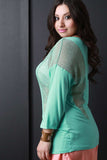 This plus size jersey knit top features a round neckline, long dolman sleeves with dropped shoulders, and semi-sheer knit panels. Accessories sold separately. Made in U.S.A. Self: 95% Rayon, 5% Spandex. Contrast: 87% Polyester, 10% Rayon, 3% Spandex.