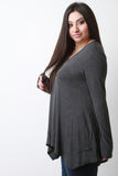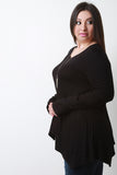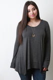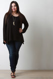 This casual plus size top features a round neckline, long sleeves, jersey knit fabrication and finished with a sharkbite hemline. Accessories sold separately. Made in U.S.A. 95% Rayon, 5% Spandex.