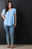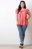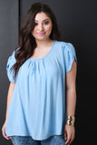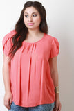 This plus size top features scoop neckline, ruched detail, short petal sleeves, back keyhole cutout with single button closure at nape, and relaxed fit. Accessories sold separately. 100% Rayon.