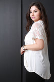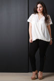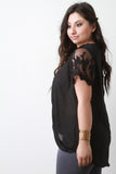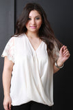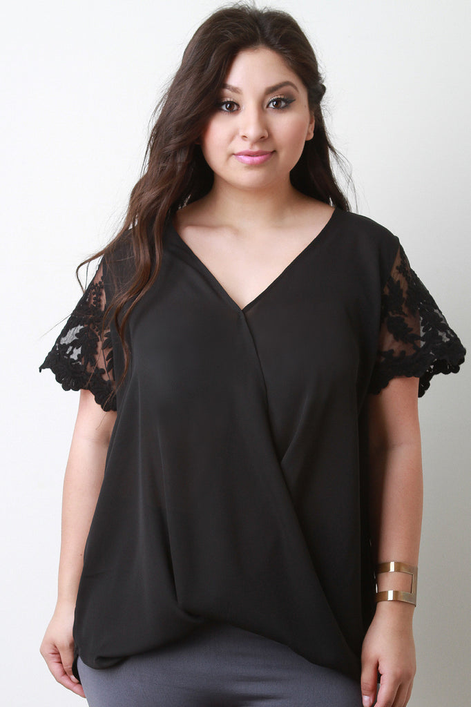 This plus size top features lightweight woven fabric, surplice front, v-neckline, crochet and semi-sheer mesh short sleeves, and slight high-low hem. Accessories sold separately. 100% Polyester.