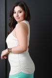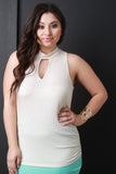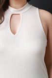 This plus size top features a mock neckline, sleeveless construction, and a keyhole cutout at front. Finished with a ribbed knit fabrication and gathered sides. Accessories sold separately. 97% Rayon, 3% Spandex.