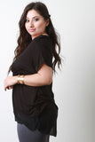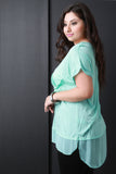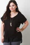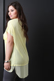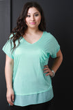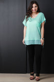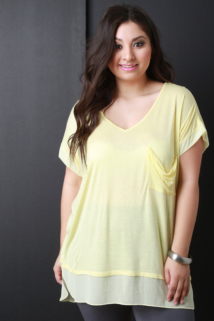 This plus size top features soft semi-sheer knit, deep v-neckline, short sleeves, left breast pocket, and sheer chiffon hem panel. Accessories sold separately. Made in U.S.A. S: 100% Rayon, L: 100% Polyester.