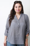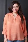 This plus size top features half placket neckline with double buttons, flat collar, quarter-length sleeves with button tab, and relax fit. Accessories sold separately. Made in U.S.A. 100% Cotton.