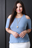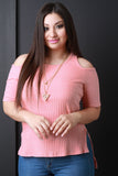 This plus size top features a round neckline, short sleeves with cold shoulder design and ribbed knit fabrication. Finished with a high low hemline and includes detachable necklace. Other accessories sold separately. Made in U.S.A. 48% Polyester, 48% Cotton, 4% Spandex.