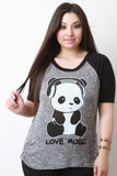 This plus size top features a soft knit fabrication, panda with "LOVE MUSIC" graphic print at front, round neckline, short sleeves design, and gathered material at sides. Accessories sold separately. 97% Rayon, 3% Spandex. Contrast: 49% Rayon, 47% Polyester, 4% Spandex.