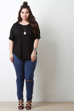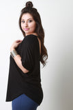 This casual plus size top features a round neckline, halter back, and short sleeves construction. Finished with a jersey knit fabrication and round hemline. Accessories sold separately. Made in U.S.A. 95% Rayon, 5% Spandex.