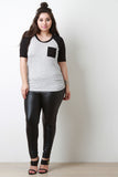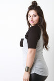 This plus size top features a round neckline, color block shoulder design, and short sleeves. Finished with jersey knit fabrication, gathered material on sides and a breast pocket . Accessories sold separately. 49% Rayon , 47% Polyester, 4% Spandex. Contrast: 97% Rayon, 3% Spandex.