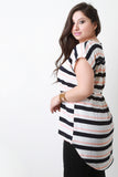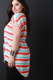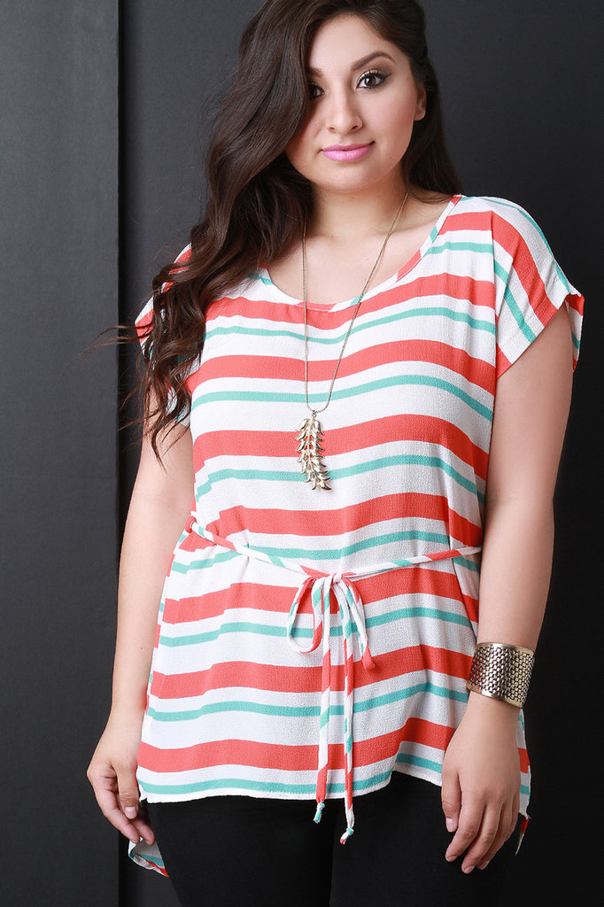 This striped fabrication, round neckline, short cap sleeves design, drawstring waistline, and high-low shirttail hemline. Accessories sold separately. Made in U.S.A. 100% Polyester.