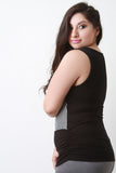 This top features a ribbed knit fabrication, scooped neckline, sleeveless construction, and striped design in mid area. Finished with a buttoned tab detail on shoulders, and cinched sides. Accessories sold separately. Made in U.S.A. 95% Rayon, 5% Spandex.
