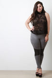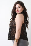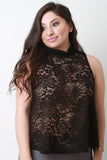 This top features a semi-sheer fabrication, floral lace design, mock neckline, sleeveless construction, and cropped hemline. Finished with a double button hook at nape for closure and back keyhole. Accessories sold separately. Made in U.S.A. 90% Nylon, 10% Spandex.