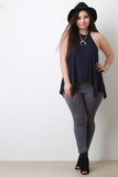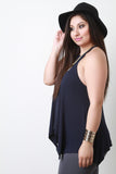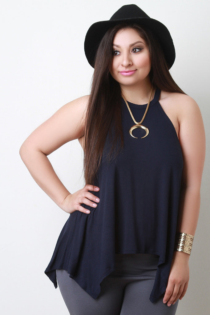 This plus size top features a ribbed knit fabrication, high neck design, sleeveless construction, and asymmetrical sharkbite hemline. Accessories sold separately. Made in U.S.A. 95% Rayon, 5% Spandex.