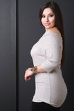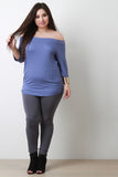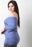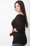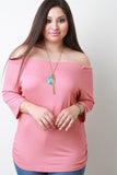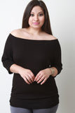 This plus size top features an off the shoulder neckline, short sleeves, gathered material on sides and finished with a rib knit fabrication. Accessories sold separately. 97% Rayon, 3% Spandex.