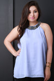This top features a mock neckline with rhinestones detail, sleeveless construction, and keyhole opening at back. Finished with a lined underlay, and two hidden hook closure at nape. Accessories sold separately. 100% Polyester.