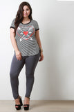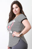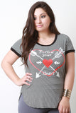 This plus size tee features a striped knit fabrication with contrast solid knit trims, "Follow your heart" graphic print at front, rounded neckline, short sleeves, and curved hem. Accessories sold separately. 97% Rayon, 3% Spandex.