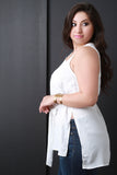 This plus size top features a flowy knit fabrication, round neckline, sleeveless construction, and self-tie sash closure at waist. Finished with two side slits. Accessories sold separately. Made in U.S.A. 100% Polyester.