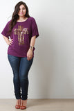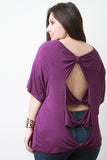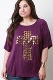 This plus size top features a soft knit fabrication, round neckline, short dolman sleeves, cross print at front, and quadruple cutout bow design at the back. Accessories sold separately. Made in U.S.A. 97% Rayon, 3% Spandex.